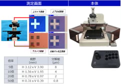 貼り合せ内部の同一座標にオートフォーカス機能でピント自動調整し、パターン検出後にマッチングを行い貼り合せ内部のパターン中心ズレ、微小線幅を自動測定を行います。